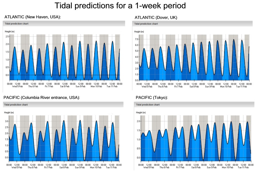 In the Atlantic there are two high tides and two low tides in every 24 hours. That's called "semi-diurnal tides". New York and London have classic semi-diurnal tides. The height of each high tide, and the fall to each low tide, is almost the same as the previous one.